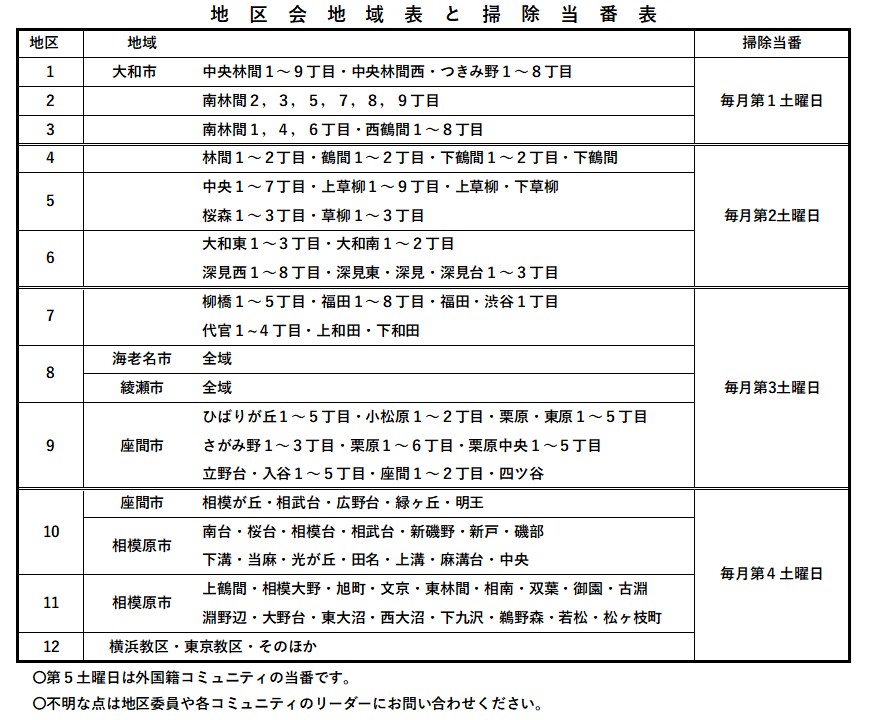 第4土曜日⇒10地区、11地区、12地区第5土曜日⇒各外国籍コミュティ